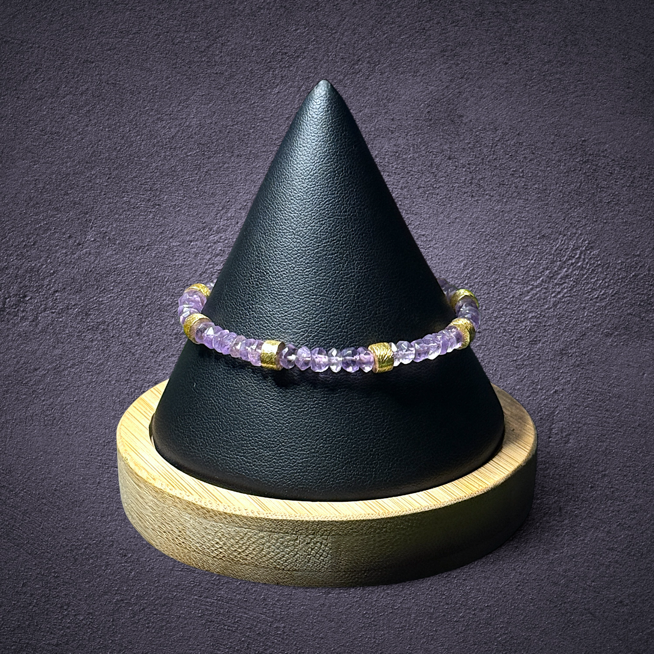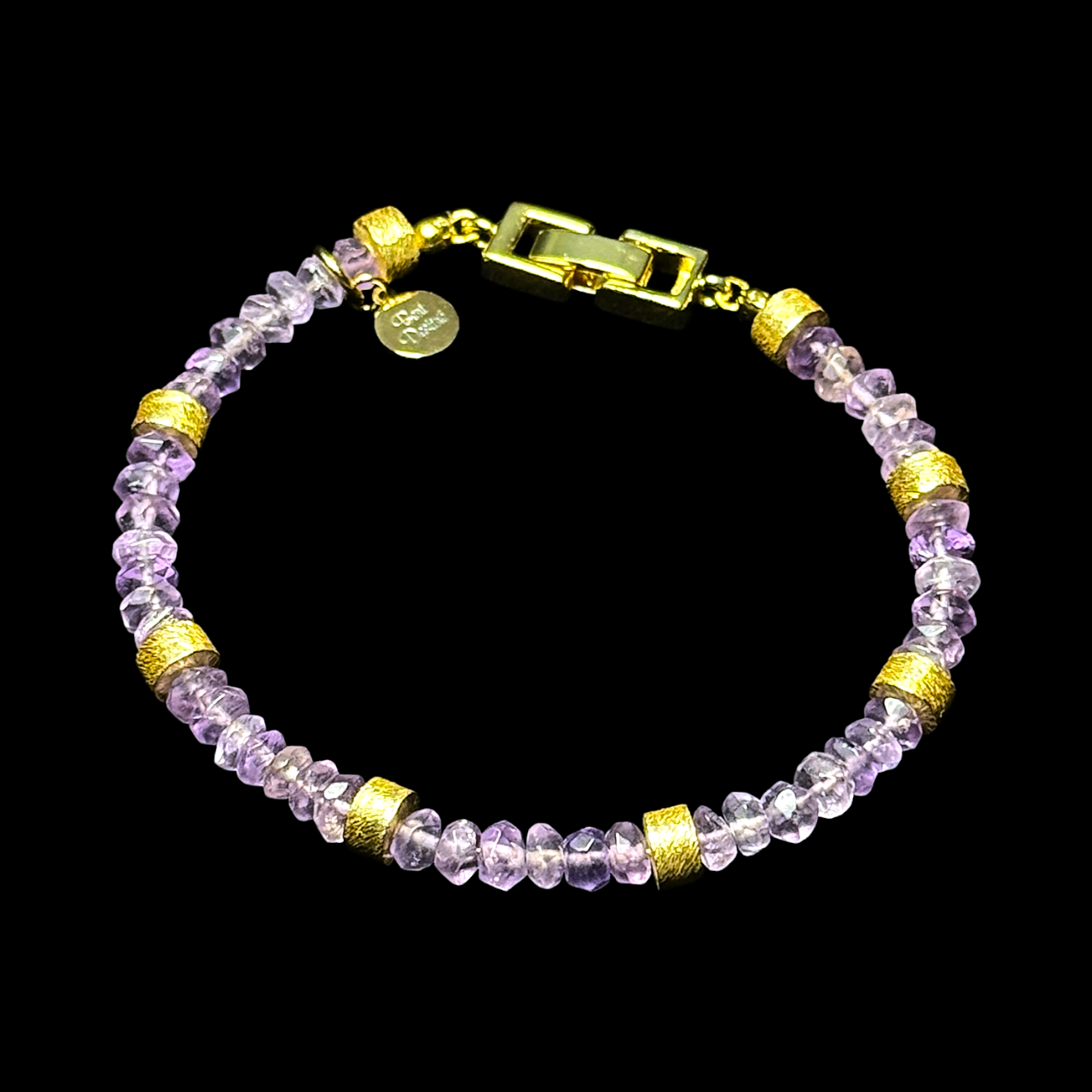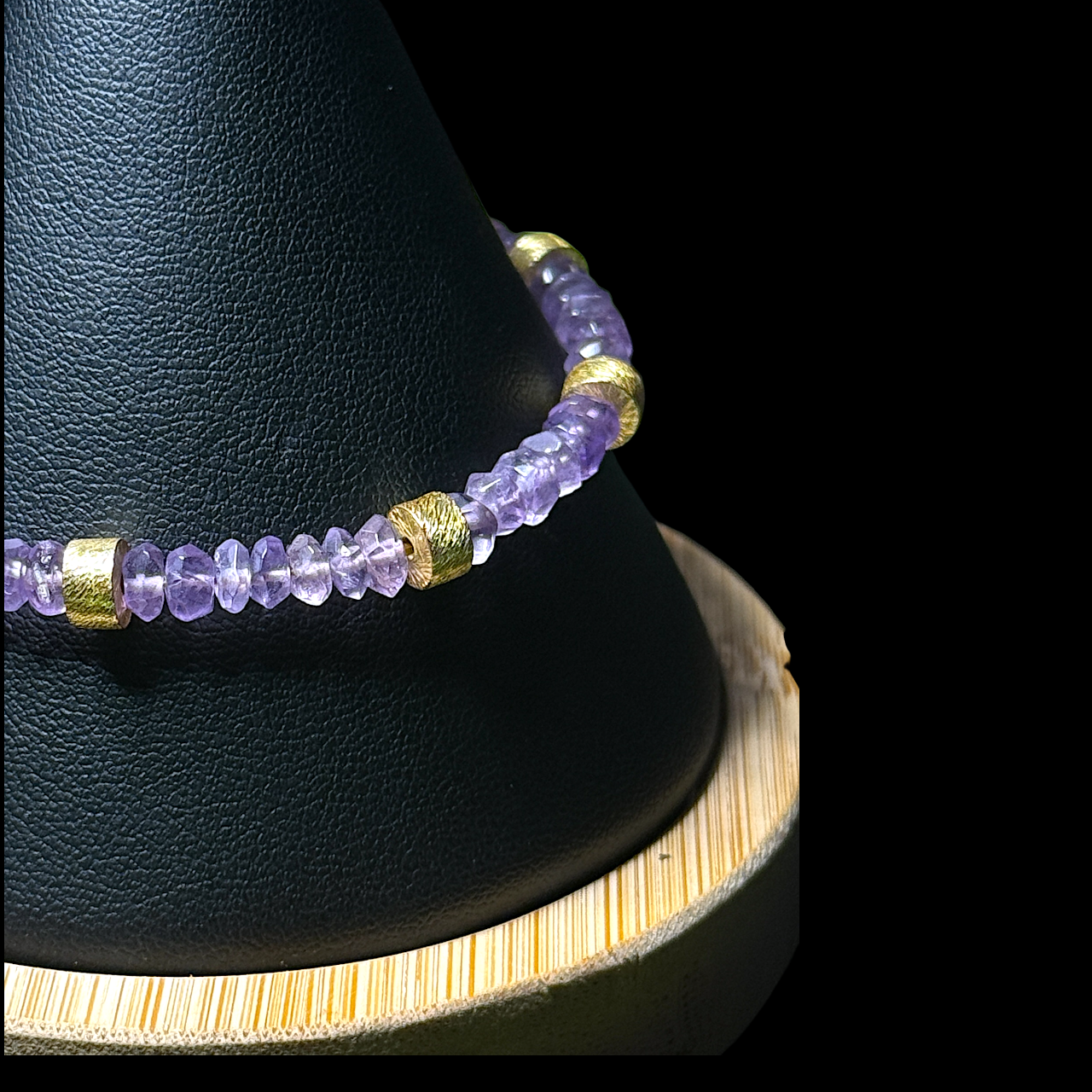 💜 Amethyst Bracelet — “The Mind’s Light” A luminous Amethyst centerpiece anchors this bracelet with a sense of calm and depth. The round amethyst beads catch the light in royal shades of violet, balanced by golden brushed spacers.