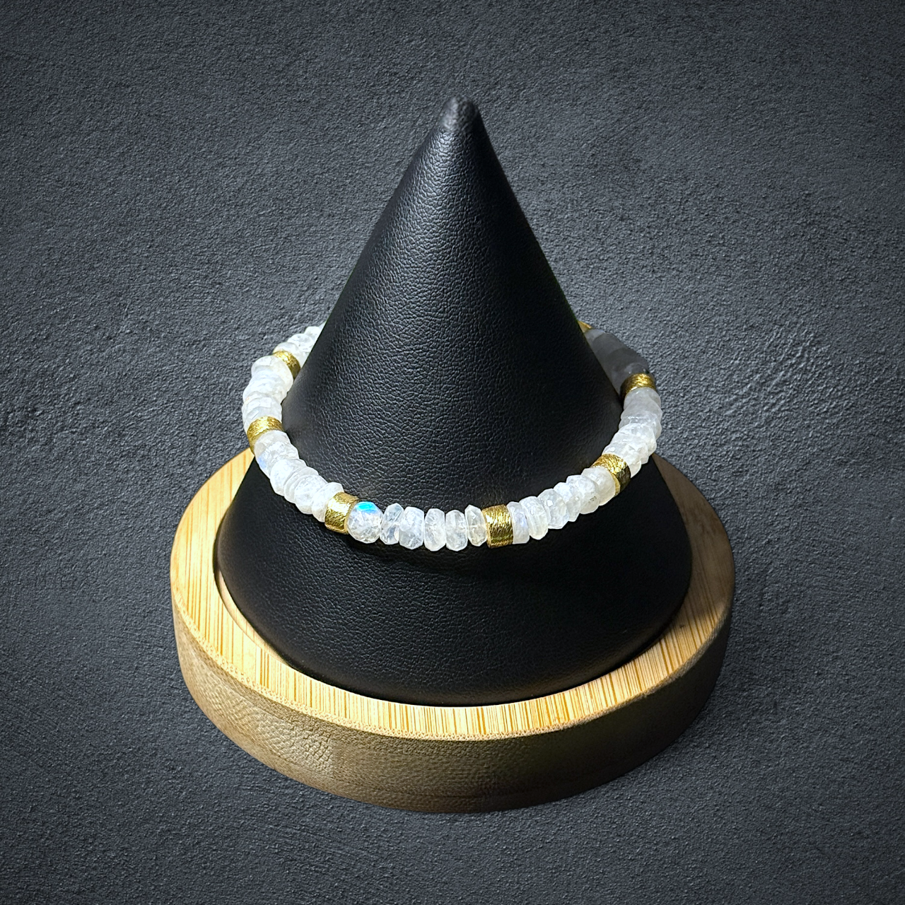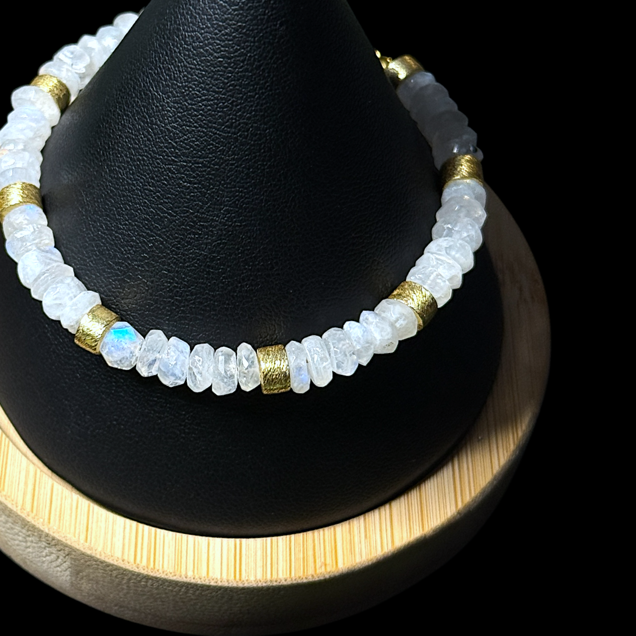 💧 Aquamarine & Spectrolite Bracelet — “The Calm Visionary” Cool-toned Aquamarine beads meet a raw Spectrolite centerpiece wrapped in brushed gold, creating a luminous play of sea and storm. The soft blue beads bring calm and clarity, while the Spectrolite reflects shifting flashes of light — a reminder that intuition often glows in motion.