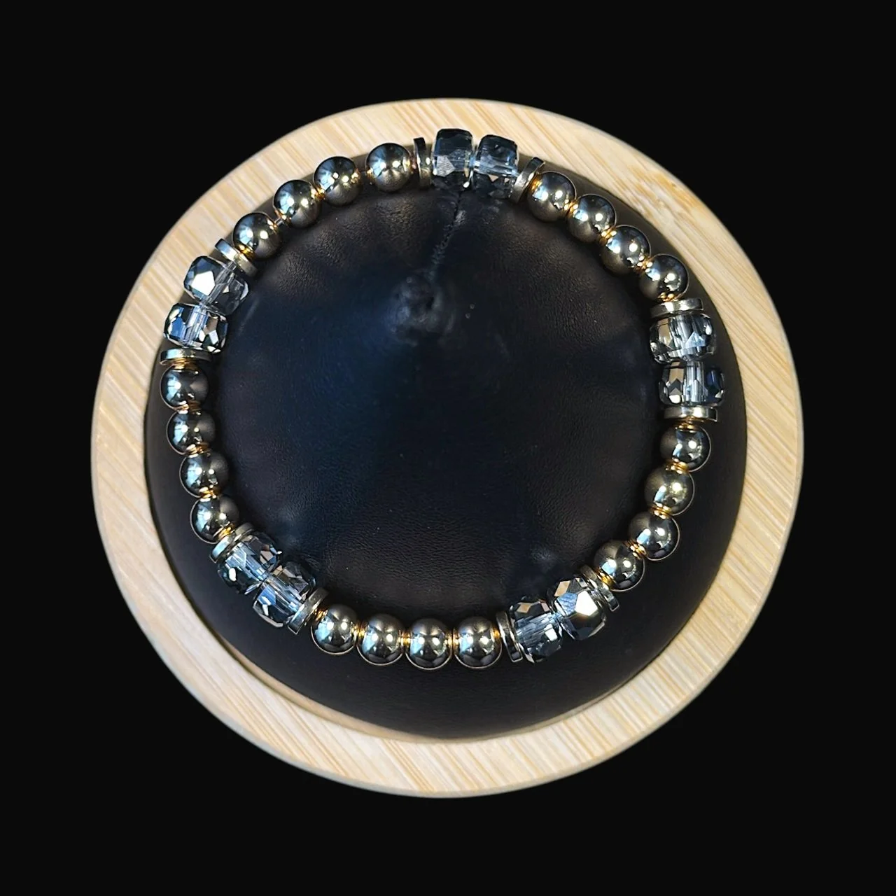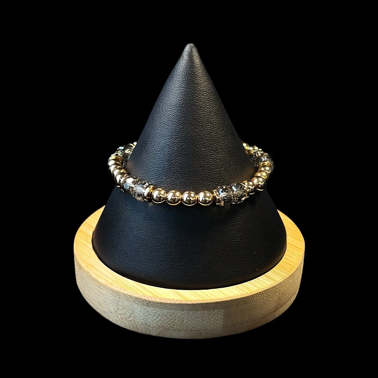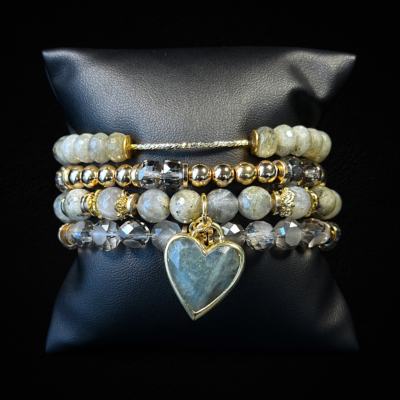 Add a splash of playful elegance to your accessory collection with this unique bracelet stack. Featuring a harmonious blend of faceted brown jade and Dalmatian jasper beads with an accent of pebble shaped rose quartz stones. This set is perfect for the trendsetter with a love for natural elements. A modern gold chain link bracelet with a textured gold charm adds a contemporary twist to the design, creating a stylish and versatile look that transitions effortlessly from day to night. Layer these bracelets together or wear them individually to express your unique style.